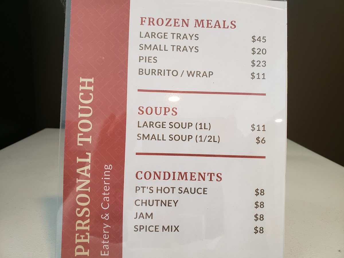 What sets Personal Touch apart is their diverse range of offerings. From large and small frozen meal trays perfect for gatherings to mouth-watering burritos and wraps, there is something to satisfy every palate. Their hearty Soup Du Jour warms the soul, while unique condiments like Pt's Hot Sauce and tantalizing chutneys enhance each dish with a burst of flavor.