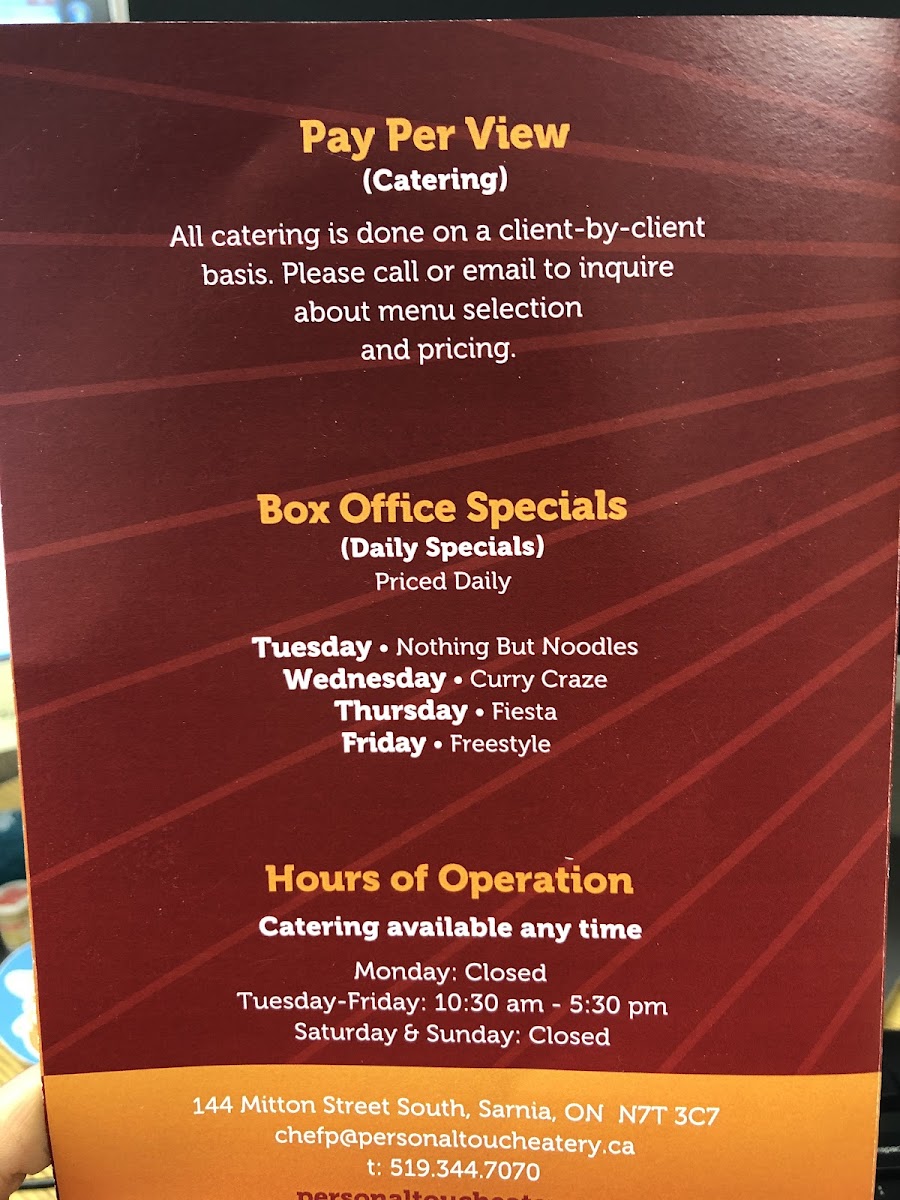Welcome to Personal Touch Eatery & Catering, a culinary gem nestled in Sarnia, Ontario. Located at 144 Mitton St S, this establishment is not just about food; it’s about creating memorable experiences that echo in every bite. Whether you’re enjoying a cozy meal at home or hosting an event, Chef Paresh brings passion and skill to the table.